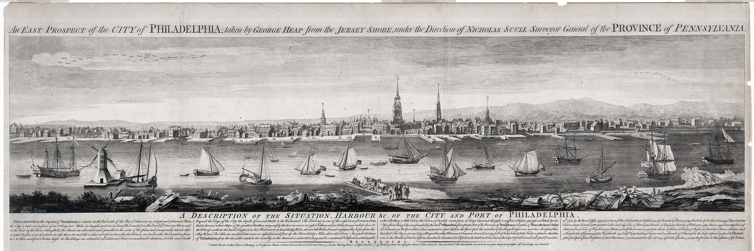 At the request of Thomas Penn, proprietor of Pennsylvania, the artist George Heap created this large view of Philadelphia, which was sent to Penn by Nicholas Scull, the Surveyor General of Pennsylvania. The drawing was engraved and printed in London from four copper-plates. This is a single sheet version of the 1754 view, engraved by T. Jefferys in 1756.