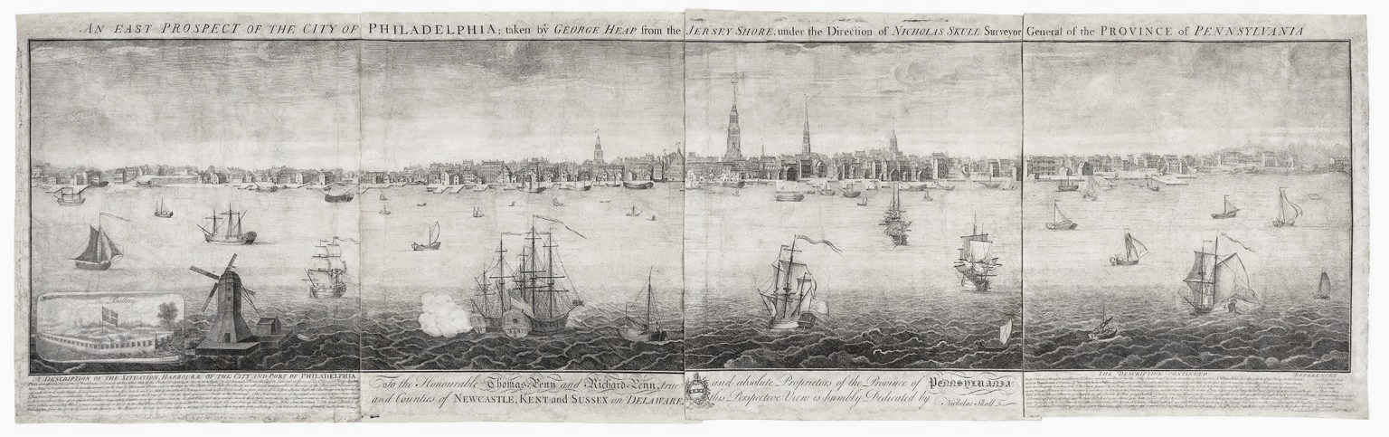 At the request of Thomas Penn, proprietor of Pennsylvania, the artist George Heap created this large view of Philadelphia, which was sent to Penn by Nicholas Scull, the Surveyor General of Pennsylvania. The drawing was engraved by Gerard Van der Gucht and printed in London from four copper-plates. It shows such landmarks as Christ Church, the State House (Independence Hall), Academy, Presbyterian Church, Dutch Calvinist Church, the Courthouse, Quaker Meeting House, and High Street Wharf. The four-sheet Scull and Heap view is extremely rare, as is the reduced size version published as a single sheet. Historic Urban Plans offers both.